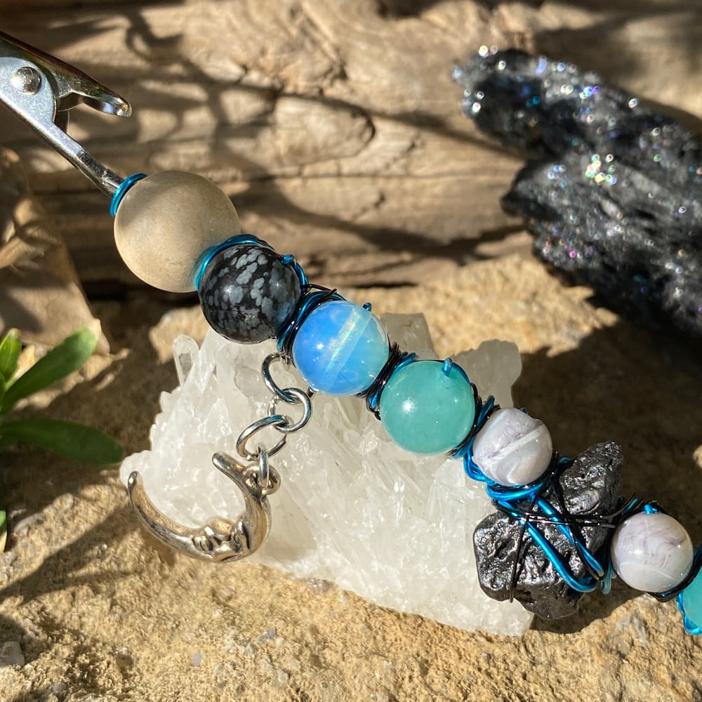 this roach clip is wrapped in blue wire, detailed with thin black wire and a moon charm 🌙