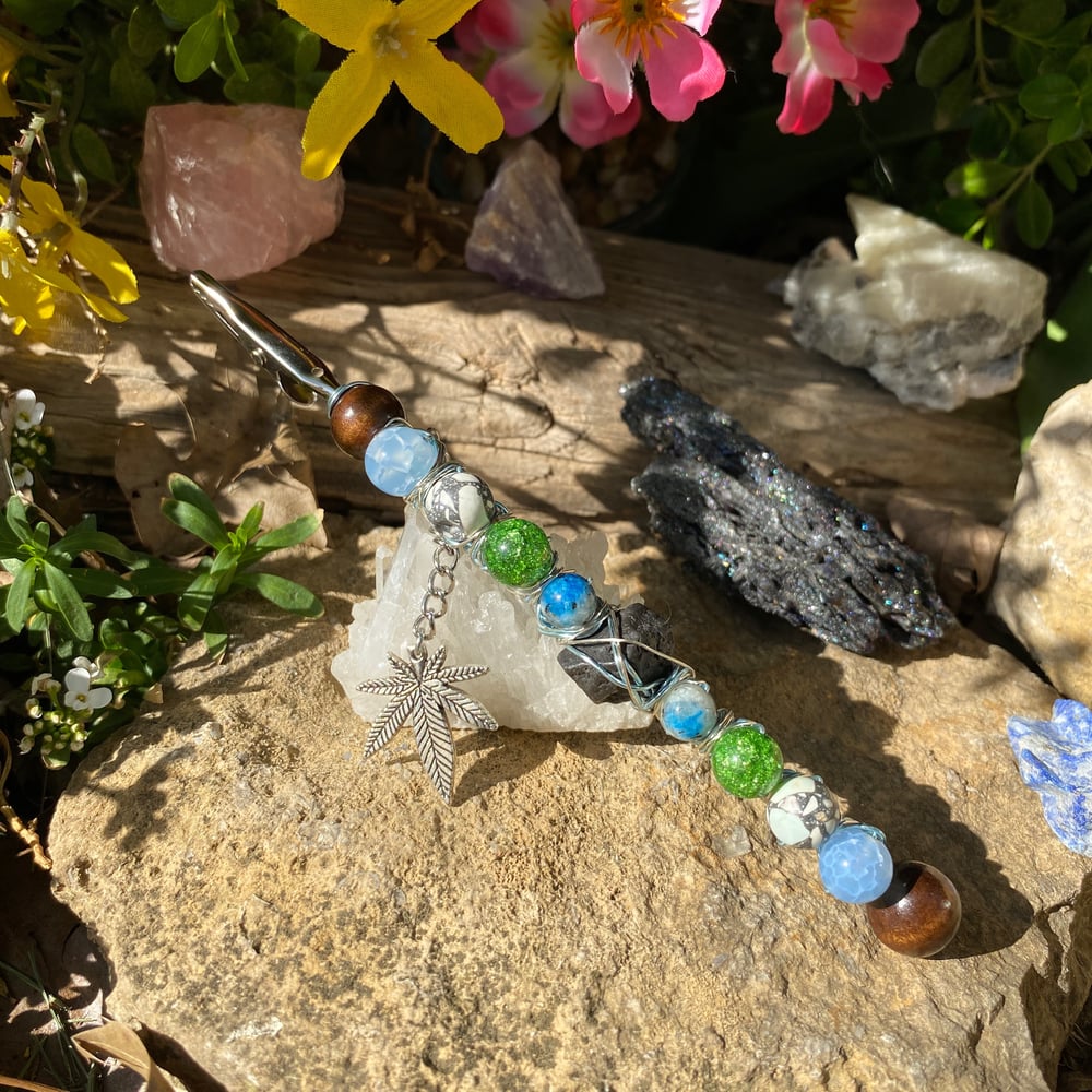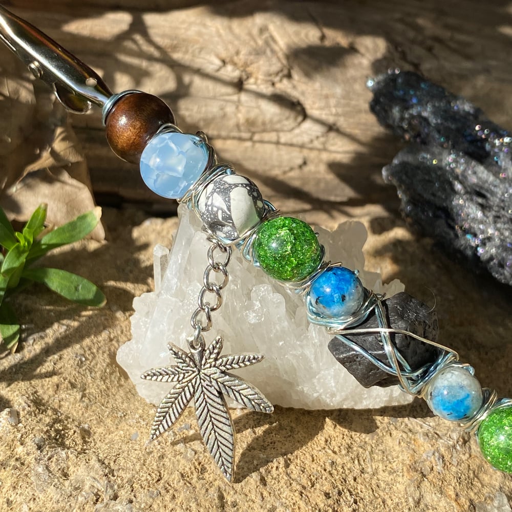 this roach clip is wrapped in light blue wire, detailed with thin silver wire and a weed charm 🍃
