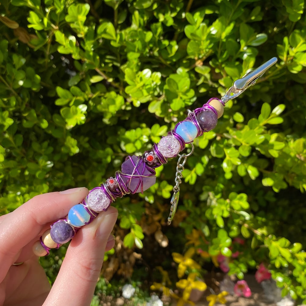 this roach clips is wrapped in purple wire, detailed with thin silver wire and a cat in the moon charm. 💜