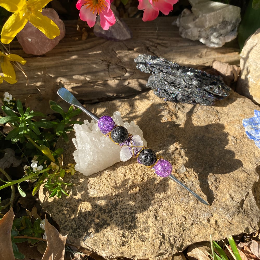 this dab tool is wrapped in light purple wire, detailed with thin gold wire and a lava bead 💜