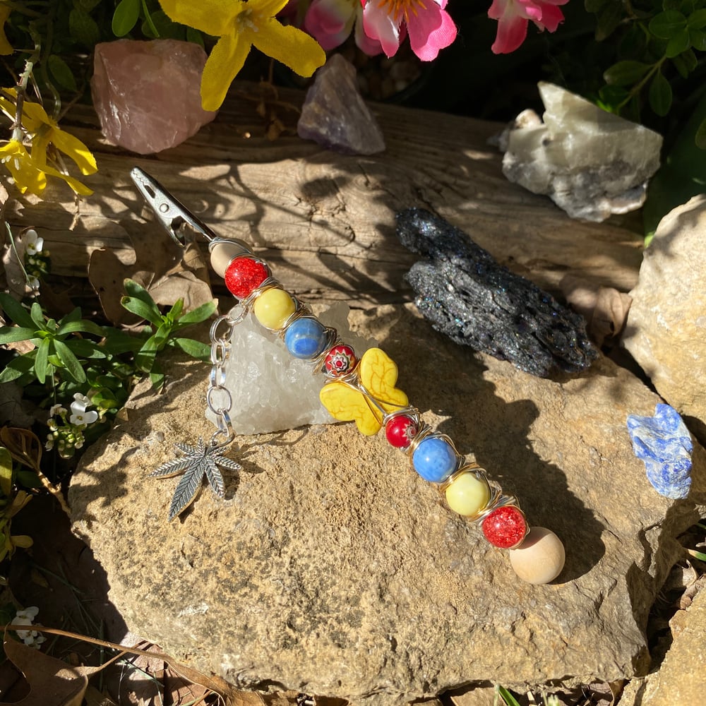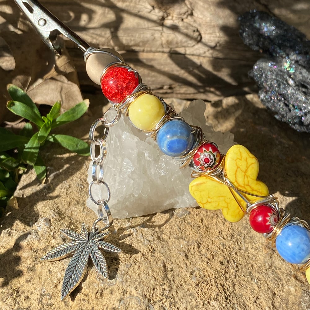 this roach clip is wrapped in thick silver wire, detailed with thin gold wire and a weed charm 🍃