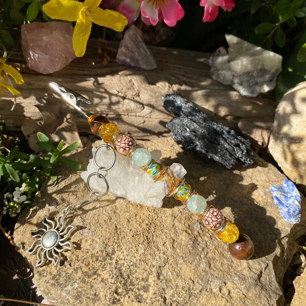 this roach clip is wrapped in gold wire, detailed with thin silver wire and a sun charm ☀️