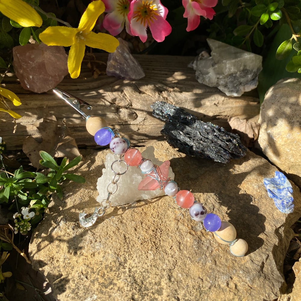 this roach clip is wrapped with blue wire, detailed with thin rose gold wire and a moon charm 🌙